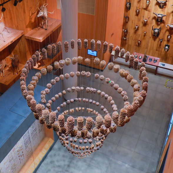 在上海天然博物馆有一个悬吊于空中近 20 米高处的“松果塔”,十分引东说念主耀眼。层峦迭嶂的松果重重叠叠、拾级而上,变成一个浩大的松塔。
