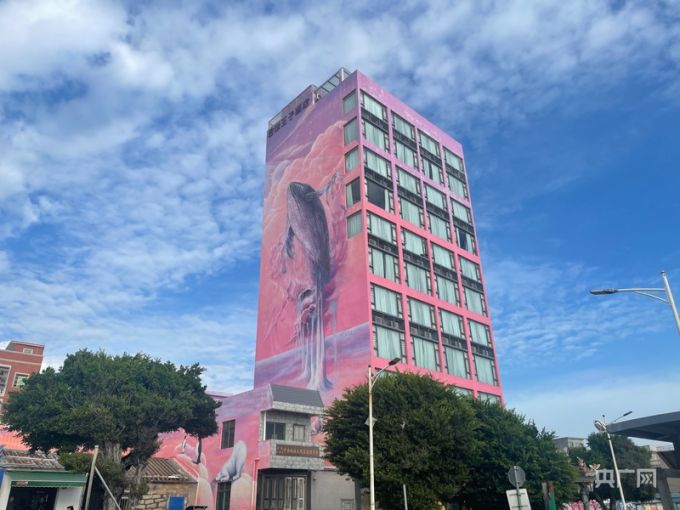 ▲红海湾斥地区遮浪街谈水龟寮村海滨街建筑外立面的“虚幻鲸山”画作(央广网见习记者 张顺鹏 摄)
